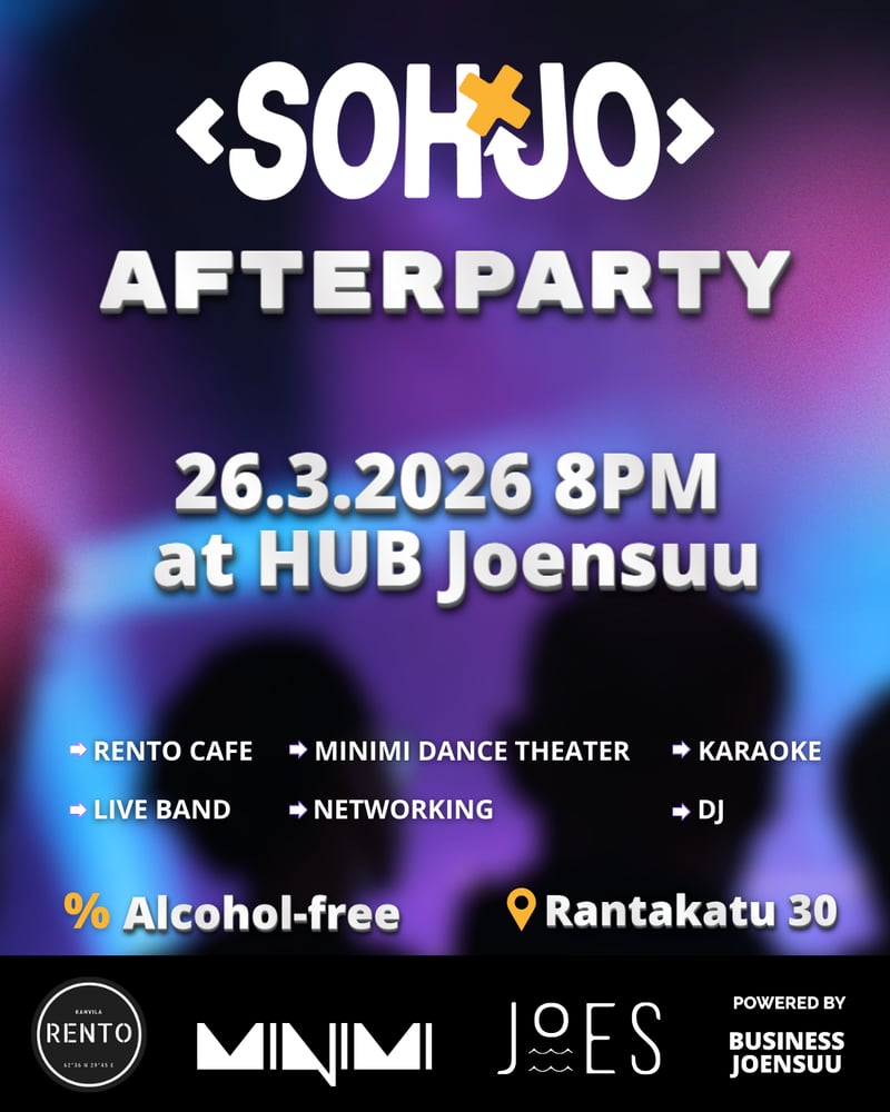 Hosted by Joensuu Entrepreneurship Society (JOES), this is the place to be once the main event wraps up on Thursday evening. Join us for a sober curious evening designed to celebrate the spirit of entrepreneurship in a relaxed, high-energy atmosphere, have a great time tonight and still show up fresh: zero hangovers for the next day of SOHJO!